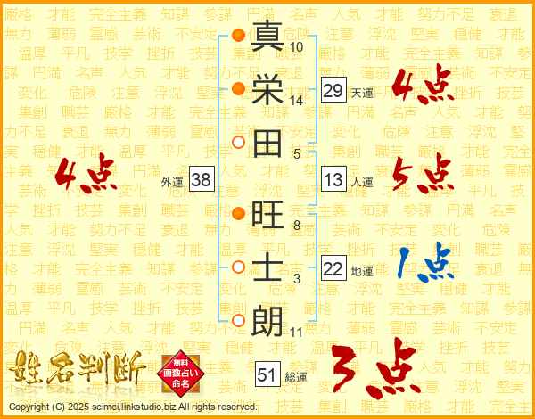 真(10画)栄(14画)田(5画) 旺(8画)士(3画)朗(11画)
