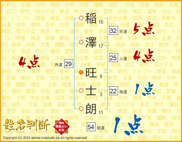 稲(15画)澤(17画) 旺(8画)士(3画)朗(11画)
