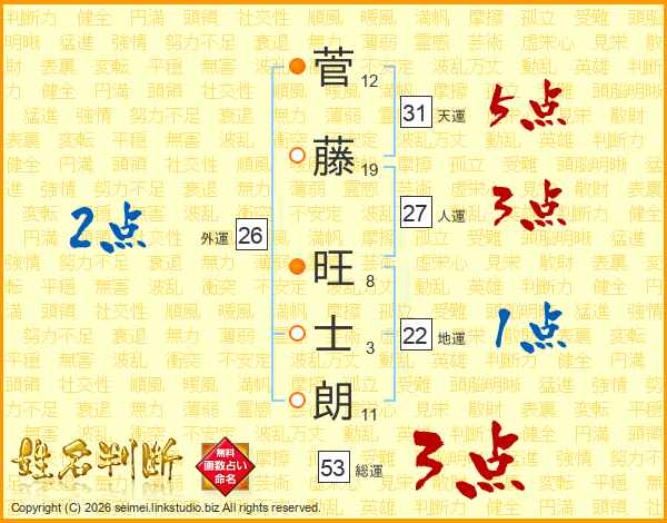 菅(12画)藤(19画) 旺(8画)士(3画)朗(11画)