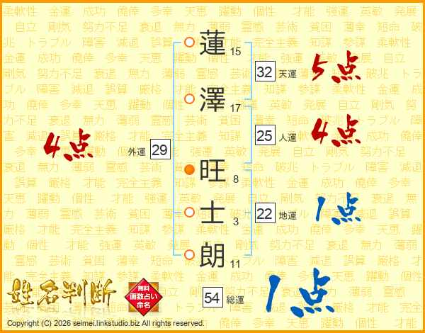 蓮(15画)澤(17画) 旺(8画)士(3画)朗(11画)