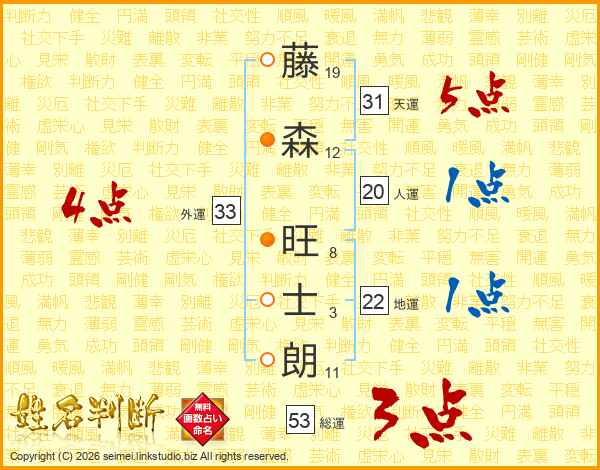 藤(19画)森(12画) 旺(8画)士(3画)朗(11画)