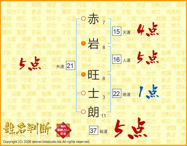 赤岩旺士朗さんの総運は37画の5点!