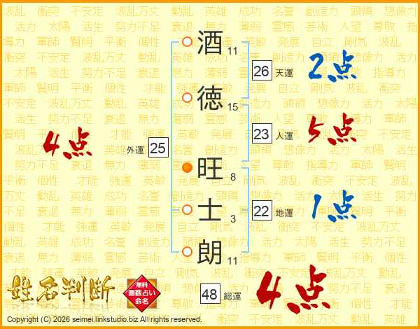 酒(11画)徳(15画) 旺(8画)士(3画)朗(11画)