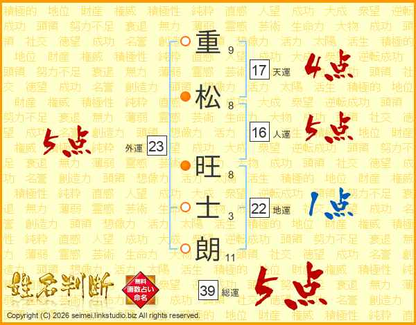 重(9画)松(8画) 旺(8画)士(3画)朗(11画)