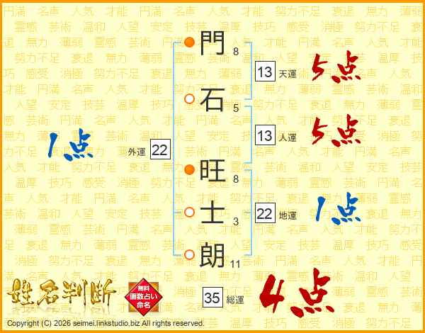 門(8画)石(5画) 旺(8画)士(3画)朗(11画)
