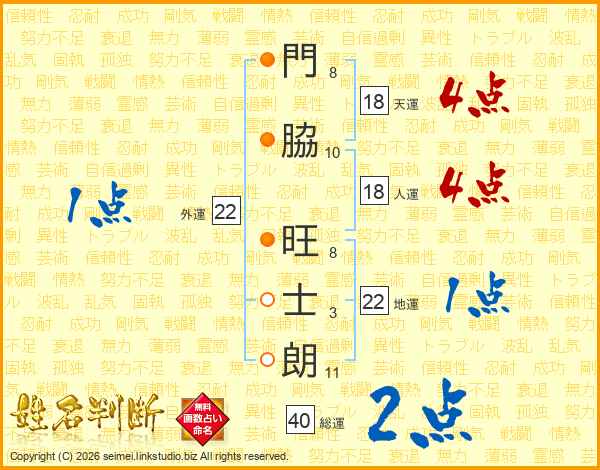 門(8画)脇(10画) 旺(8画)士(3画)朗(11画)