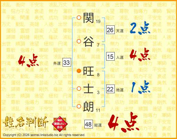 関(19画)谷(7画) 旺(8画)士(3画)朗(11画)