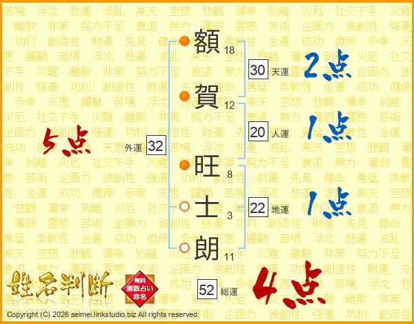 額(18画)賀(12画) 旺(8画)士(3画)朗(11画)