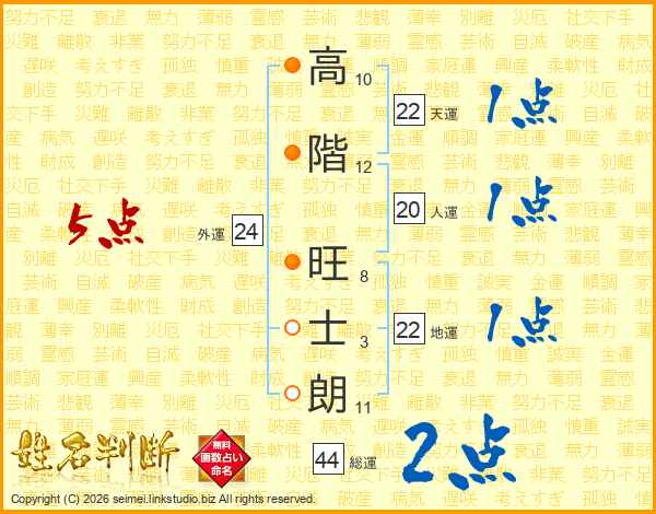 高(10画)階(12画) 旺(8画)士(3画)朗(11画)