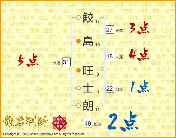 鮫(17画)島(10画) 旺(8画)士(3画)朗(11画)