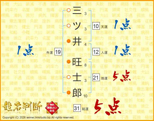 三(3画)ツ(3画)井(4画) 旺(8画)士(3画)郎(10画)