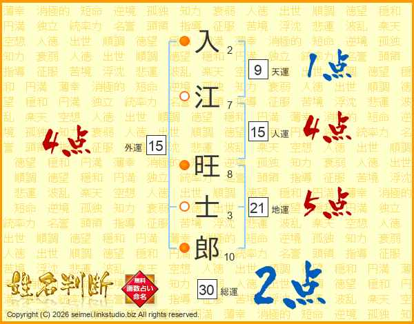 入(2画)江(7画) 旺(8画)士(3画)郎(10画)