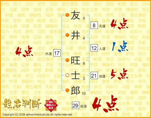 友(4画)井(4画) 旺(8画)士(3画)郎(10画)