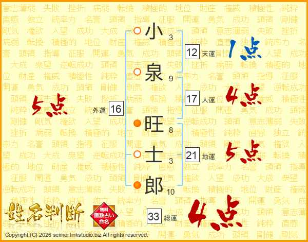小(3画)泉(9画) 旺(8画)士(3画)郎(10画)