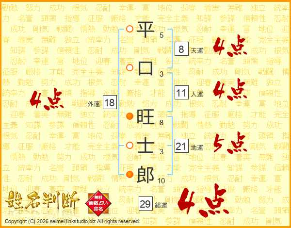平(5画)口(3画) 旺(8画)士(3画)郎(10画)