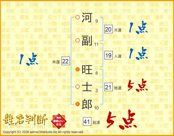 河(9画)副(11画) 旺(8画)士(3画)郎(10画)