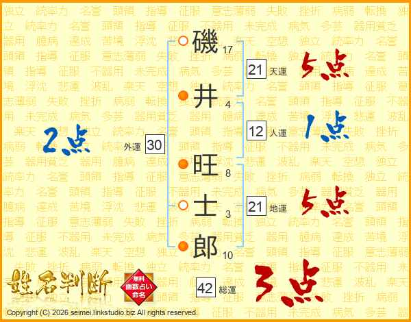 磯井旺士郎さんの天運は21画の5点!