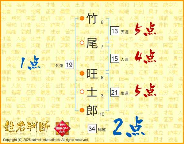 竹(6画)尾(7画) 旺(8画)士(3画)郎(10画)