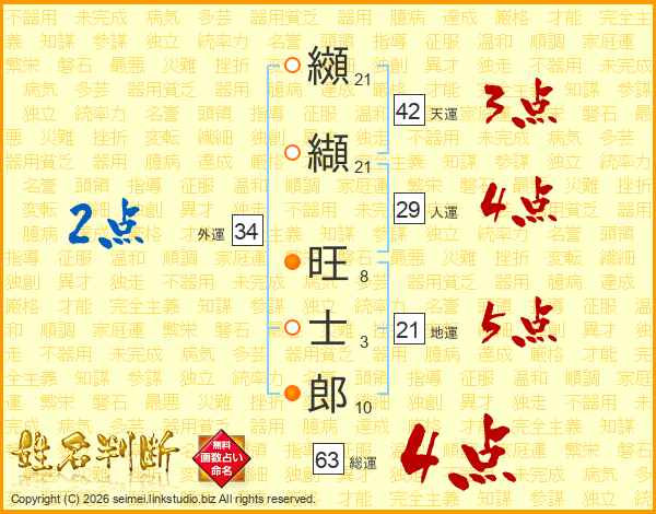 纐纈旺士郎さんの総運は63画の4点!