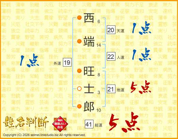 西(6画)端(14画) 旺(8画)士(3画)郎(10画)