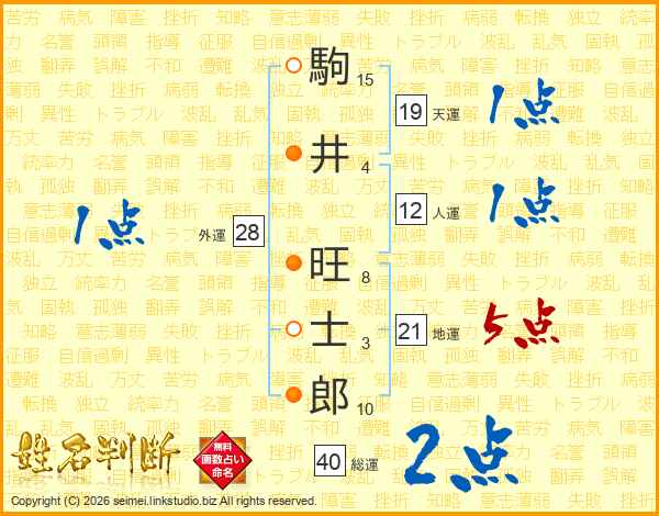 駒(15画)井(4画) 旺(8画)士(3画)郎(10画)
