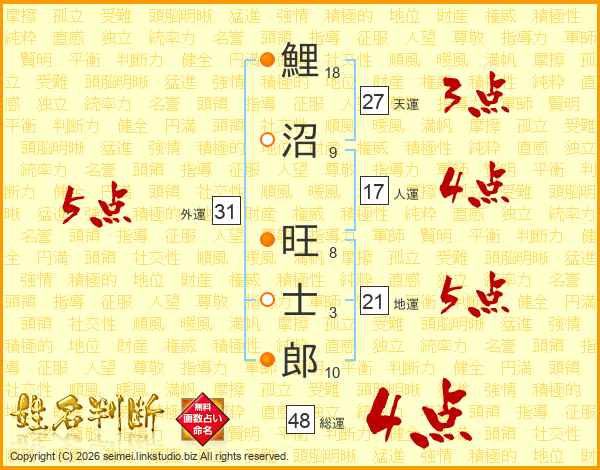鯉(18画)沼(9画) 旺(8画)士(3画)郎(10画)