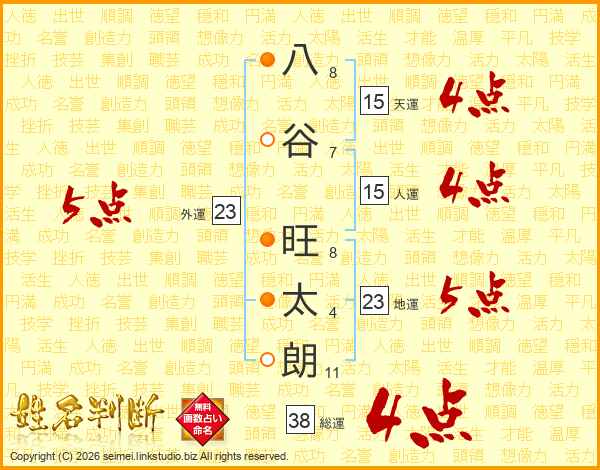 八(8画)谷(7画) 旺(8画)太(4画)朗(11画)