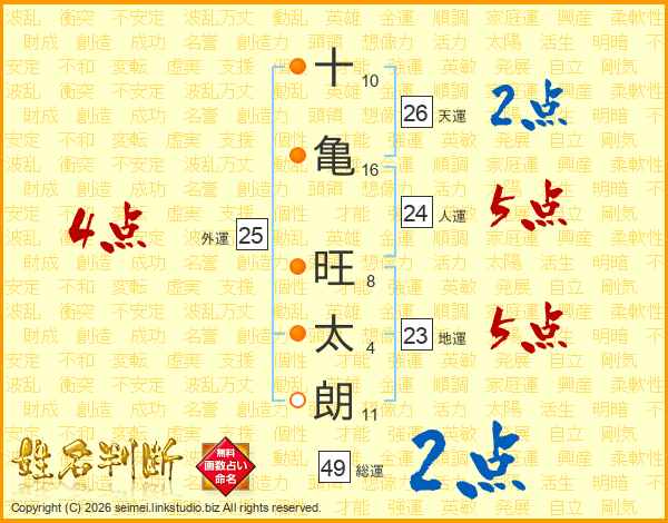 十(10画)亀(16画) 旺(8画)太(4画)朗(11画)