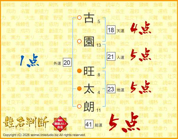 古(5画)園(13画) 旺(8画)太(4画)朗(11画)