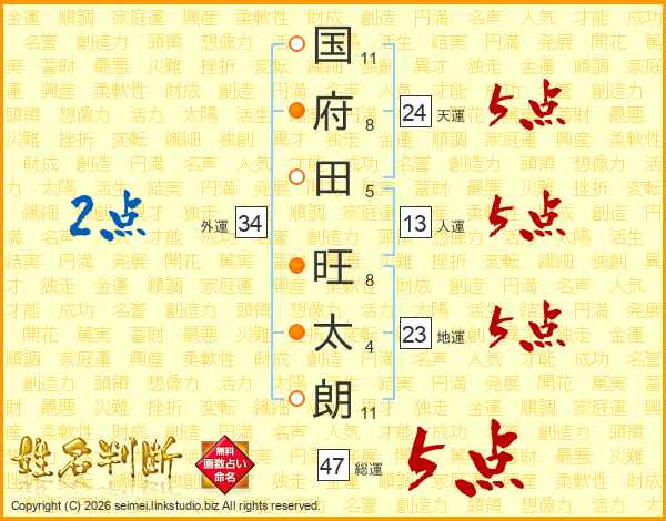 国(11画)府(8画)田(5画) 旺(8画)太(4画)朗(11画)