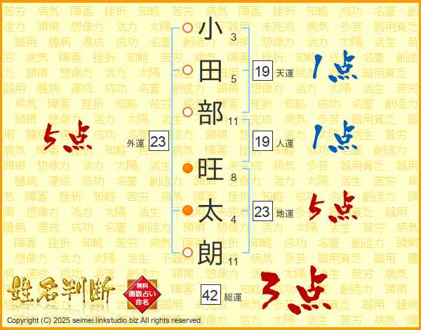 小(3画)田(5画)部(11画) 旺(8画)太(4画)朗(11画)
