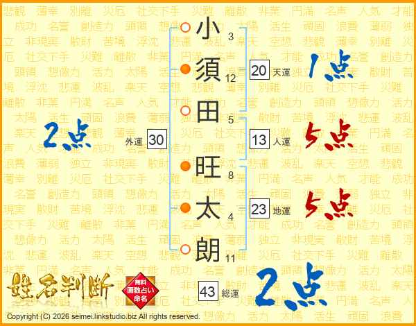 小(3画)須(12画)田(5画) 旺(8画)太(4画)朗(11画)