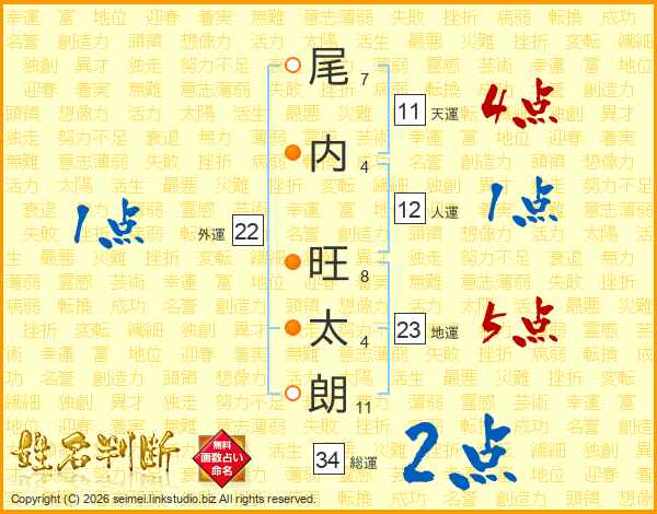 尾(7画)内(4画) 旺(8画)太(4画)朗(11画)