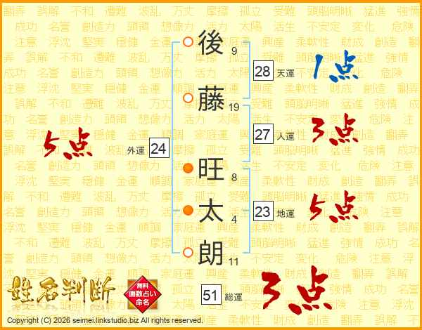 後(9画)藤(19画) 旺(8画)太(4画)朗(11画)