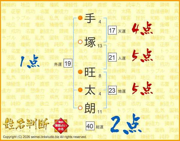 手(4画)塚(13画) 旺(8画)太(4画)朗(11画)