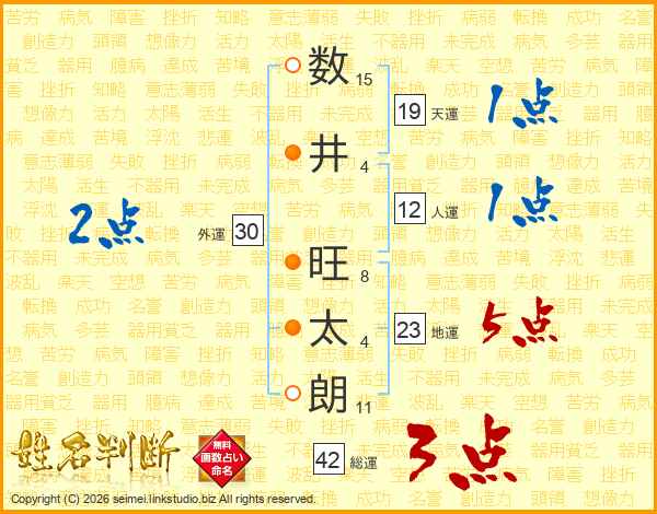 数(15画)井(4画) 旺(8画)太(4画)朗(11画)
