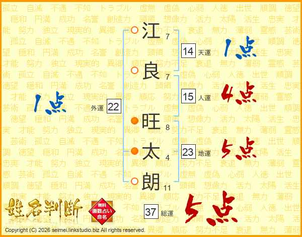 江(7画)良(7画) 旺(8画)太(4画)朗(11画)