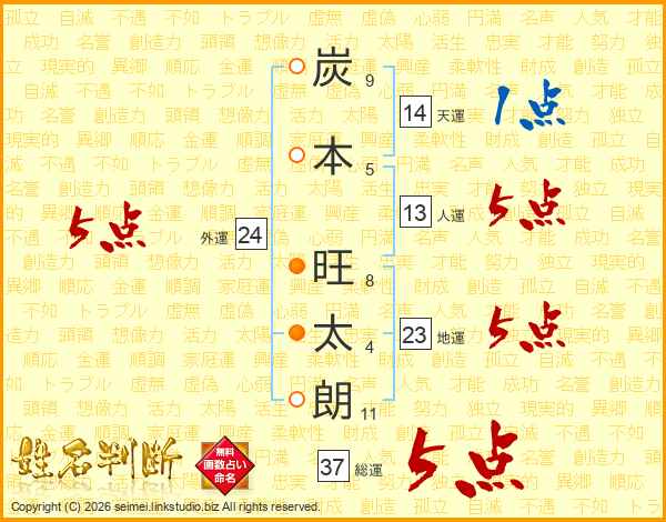 炭本旺太朗さんの総運は37画の5点!