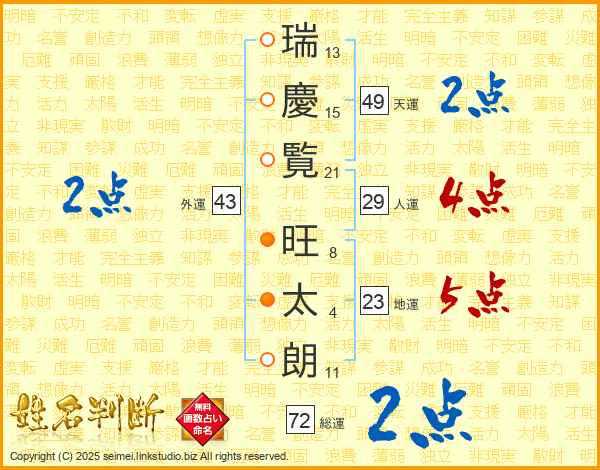 瑞(13画)慶(15画)覧(21画) 旺(8画)太(4画)朗(11画)