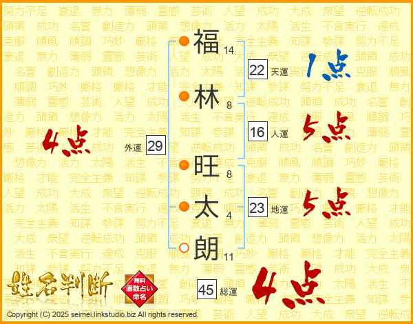 福(14画)林(8画) 旺(8画)太(4画)朗(11画)