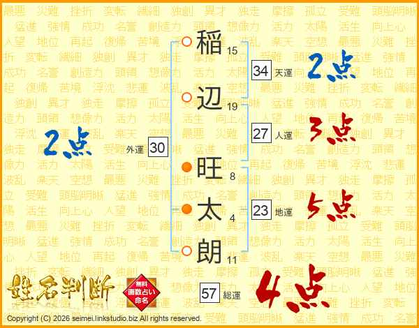 稲(15画)辺(19画) 旺(8画)太(4画)朗(11画)