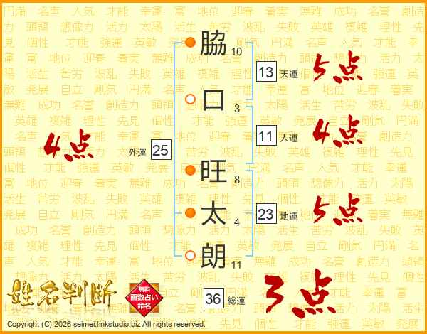 脇(10画)口(3画) 旺(8画)太(4画)朗(11画)
