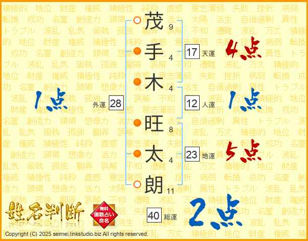 茂(9画)手(4画)木(4画) 旺(8画)太(4画)朗(11画)