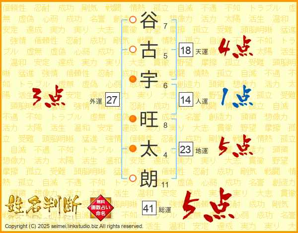 谷(7画)古(5画)宇(6画) 旺(8画)太(4画)朗(11画)