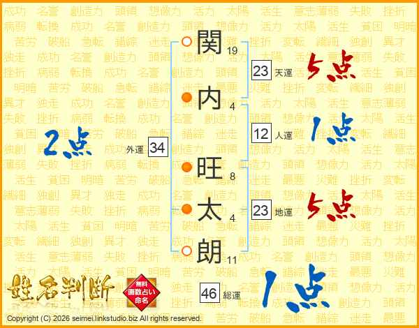 関(19画)内(4画) 旺(8画)太(4画)朗(11画)