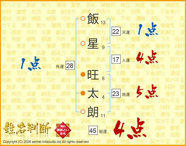 飯(13画)星(9画) 旺(8画)太(4画)朗(11画)