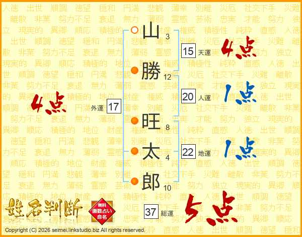 山(3画)勝(12画) 旺(8画)太(4画)郎(10画)