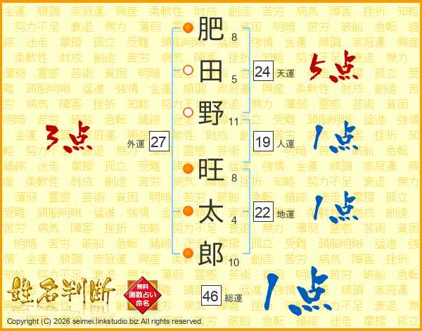 肥(8画)田(5画)野(11画) 旺(8画)太(4画)郎(10画)
