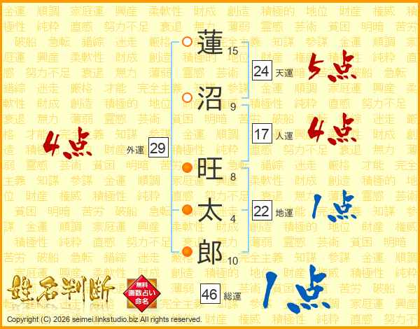 蓮(15画)沼(9画) 旺(8画)太(4画)郎(10画)