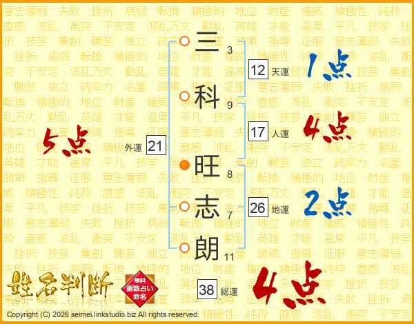 三(3画)科(9画) 旺(8画)志(7画)朗(11画)